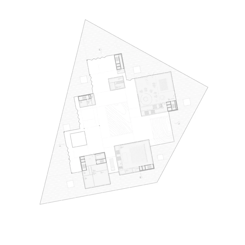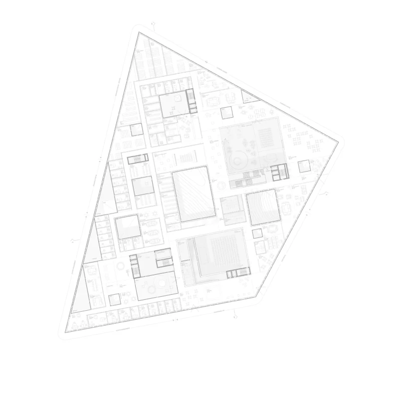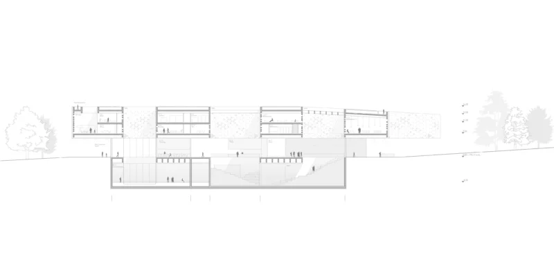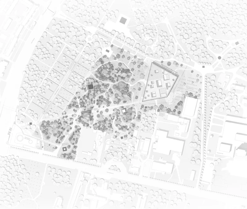 Drei Raumfolgen verweben sich entlang der verlorenen Topographie. Der Park der Empathie führt durch dichtes Gehölz und stille Erfahrungsräume in einen Zustand innerer Wachsamkeit. Das Memorialzentrum selbst erscheint als Leuchten im Wald – ein vielschichtiger Baukörper, in dem vertikale Einschnitte und Leerräume Vergangenheit, Gegenwart und Zukunft sichtbar verbinden. Die Ausstellung liegt unter der Erde, dort, wo einst die Sohle der Schlucht verlief. Darüber schwebt eine Wolke der Reflexion – Lernort und Auditorium – und ganz oben öffnet sich ein Dachgarten als Ort des Vertrauens. In seiner Erde wachsen Pflanzen aus allen Nationen, die der Holocaust berührt hat.