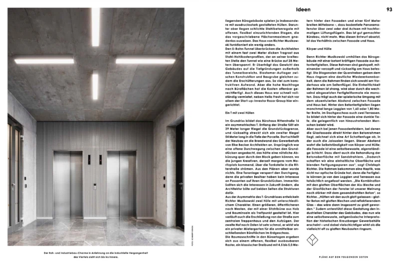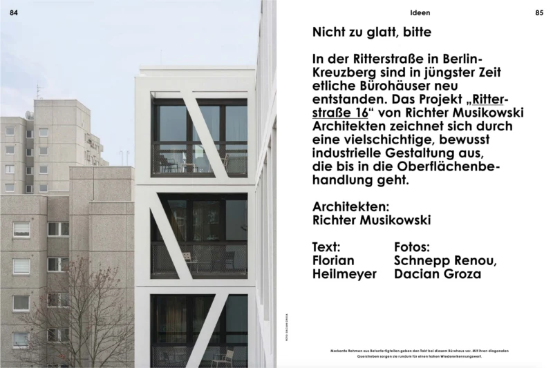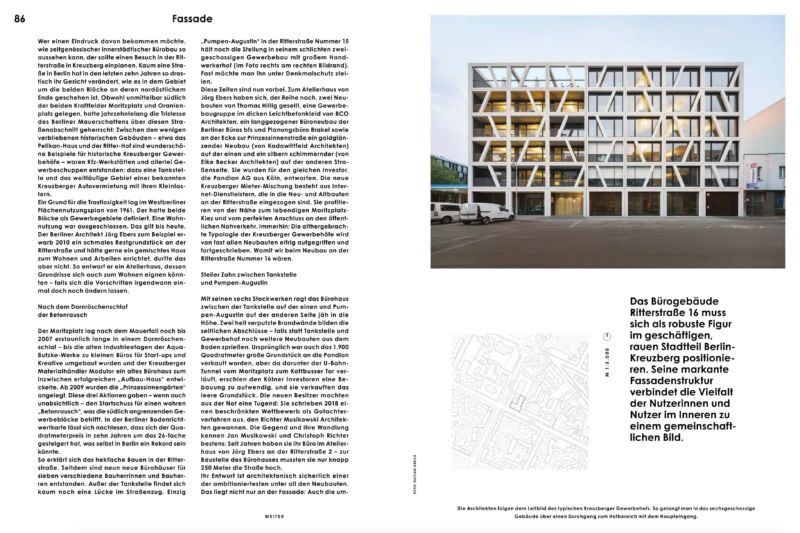 In der Baumeister Ausgabe 04/2024 mit dem Schwerpunkt Fassade findet sich ein Beitrag über das Bürogebäude Ritterstraße 16 in Berlin Kreuberg. Geschrieben von Florian Heilmeyer bebildert von Schnepp Renou und Dacian Groza.